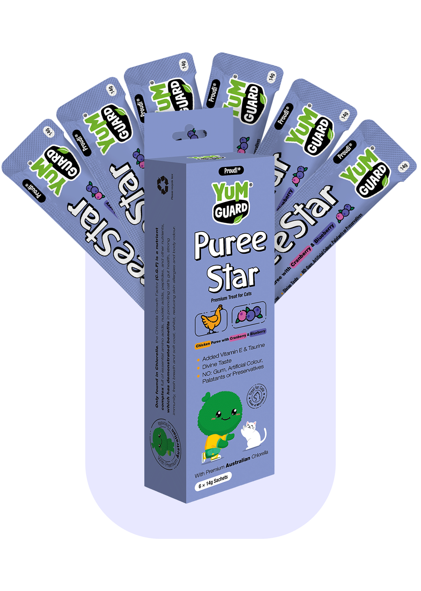 Give your cat a treat they'll love with YumGuard's Puree Star Chicken with Cranberry and Blueberry. Packed with essential vitamins, minerals, and Premium Australian Chlorella to support tissue growth and repair. With a smooth texture and rich taste, it's a treat your cat will adore!