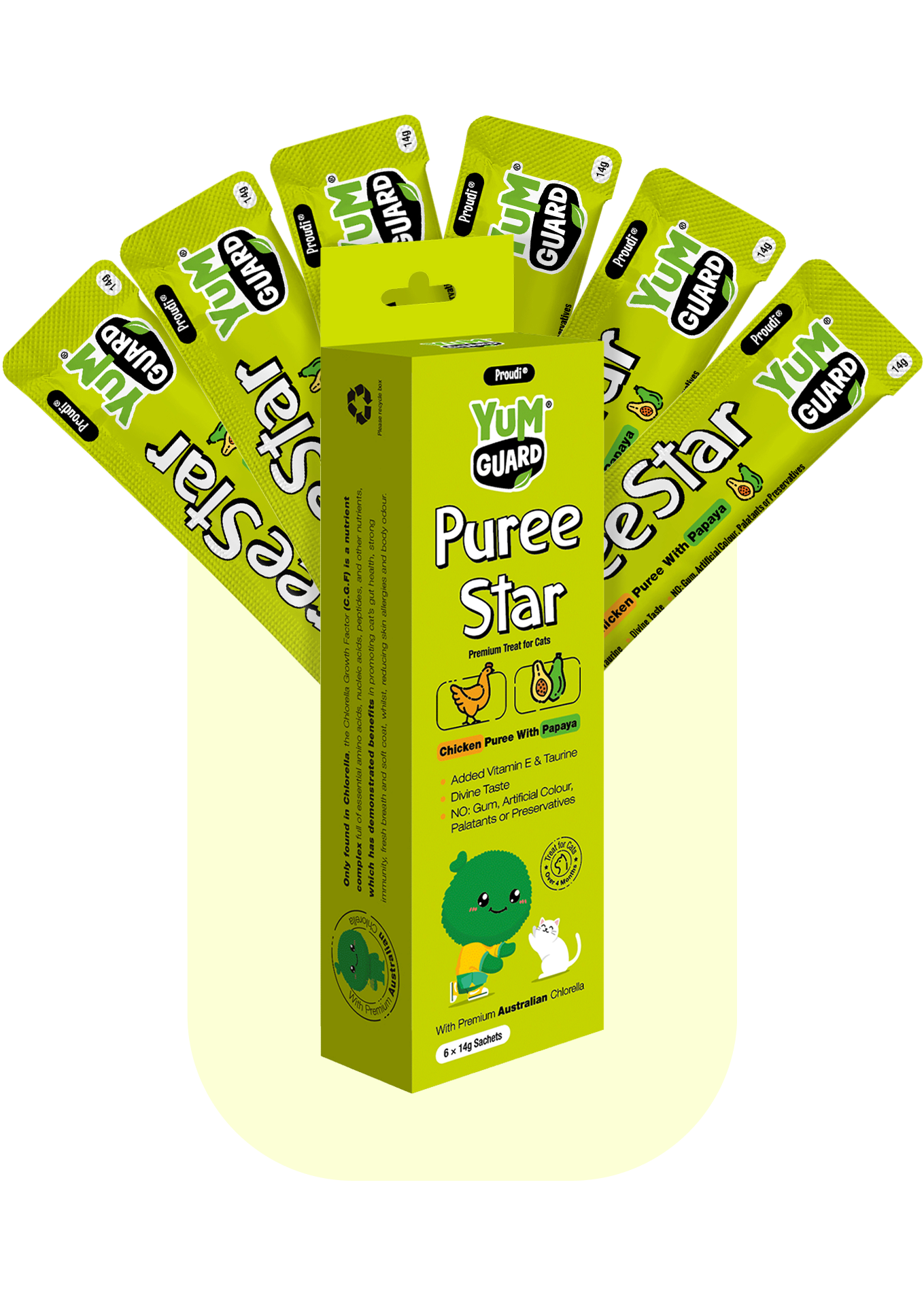 Give your cat a treat they'll love with YumGuard's Puree Star Chicken with Papaya. Packed with essential vitamins, minerals, and Premium Australian Chlorella to support tissue growth and repair. With a smooth texture and rich taste, it's a treat your cat will adore!