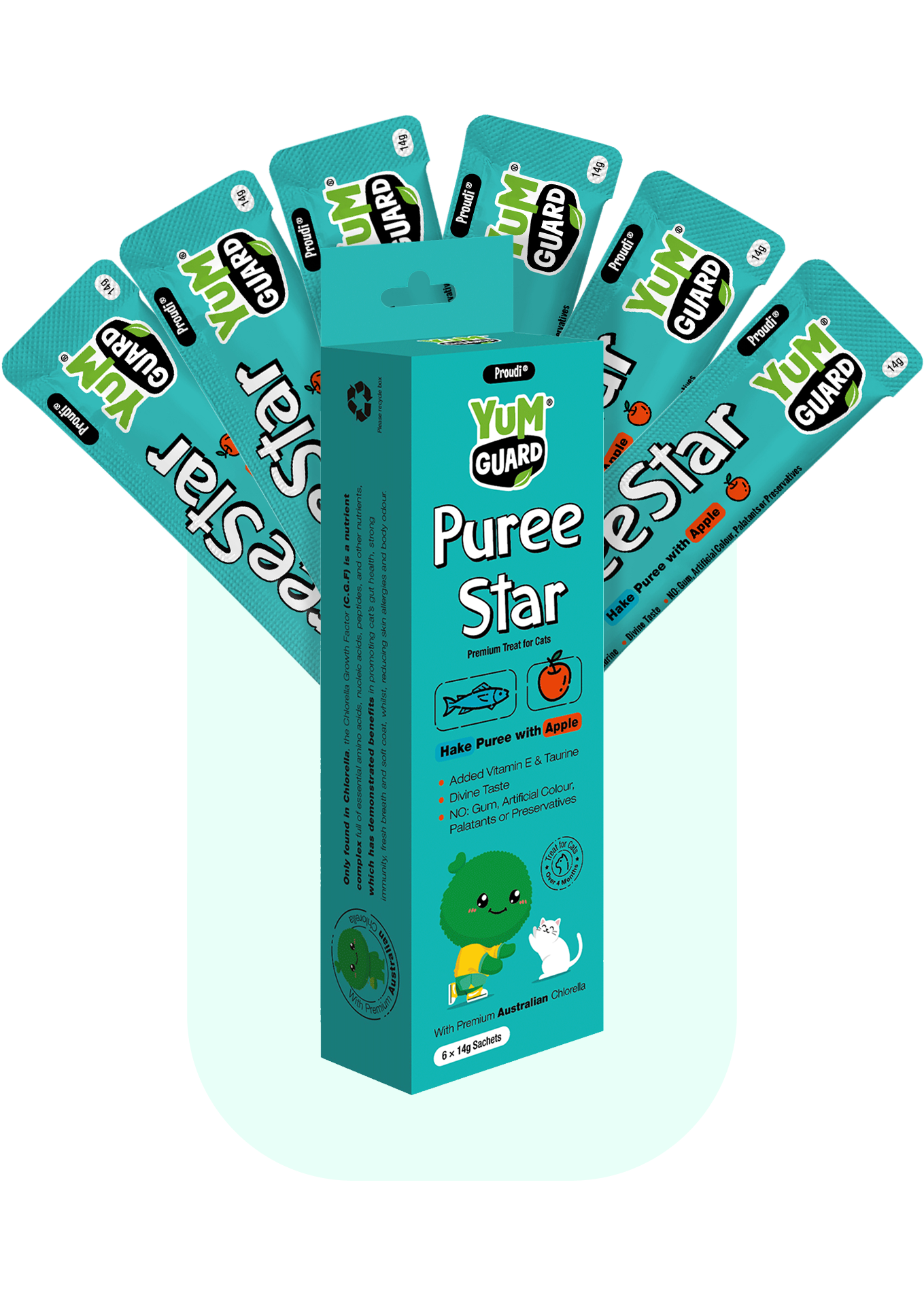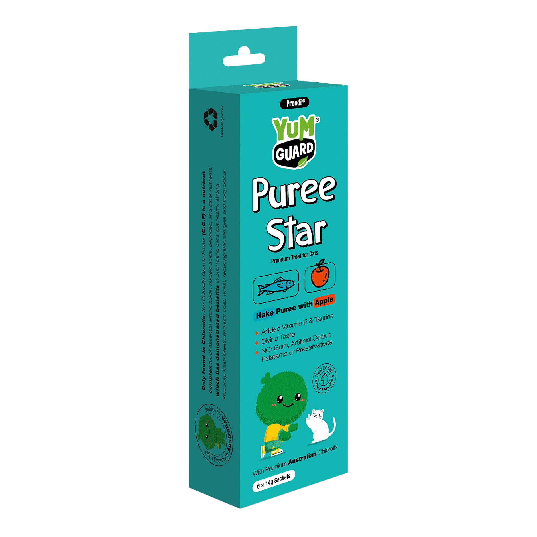 Give your cat a treat they'll love with YumGuard's Puree Star Hake with Apple. Packed with essential vitamins, minerals, and Premium Australian Chlorella to support tissue growth and repair. With a smooth texture and rich taste, it's a treat your cat will adore!
