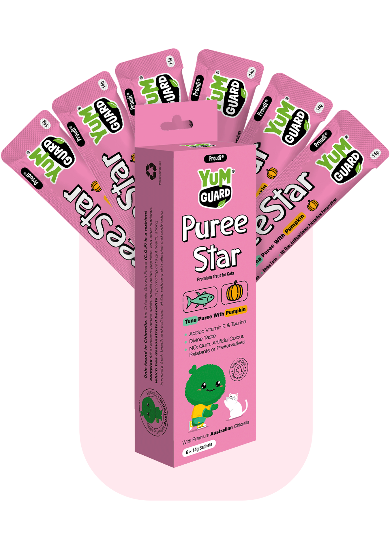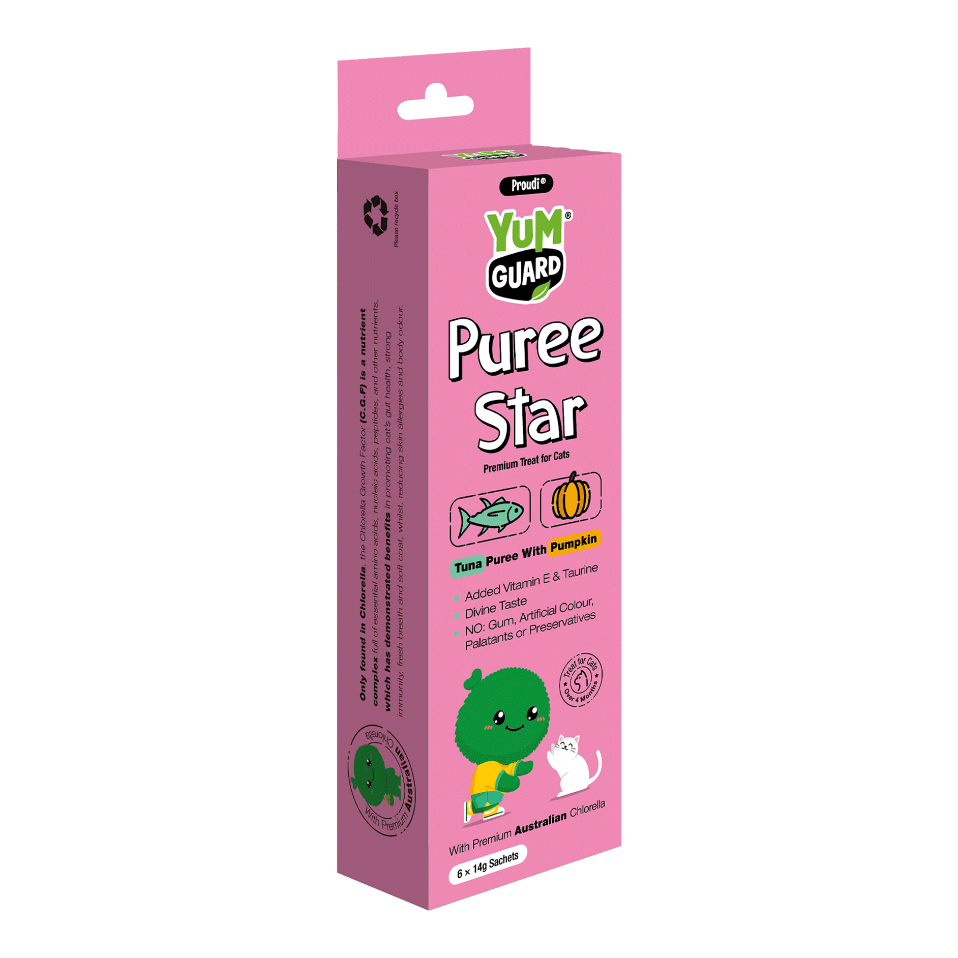 Give your cat a treat they'll love with YumGuard's Puree Star Tuna with Pumpkin. Packed with essential vitamins, minerals, and Premium Australian Chlorella to support tissue growth and repair. With a smooth texture and rich taste, it's a treat your cat will adore!
