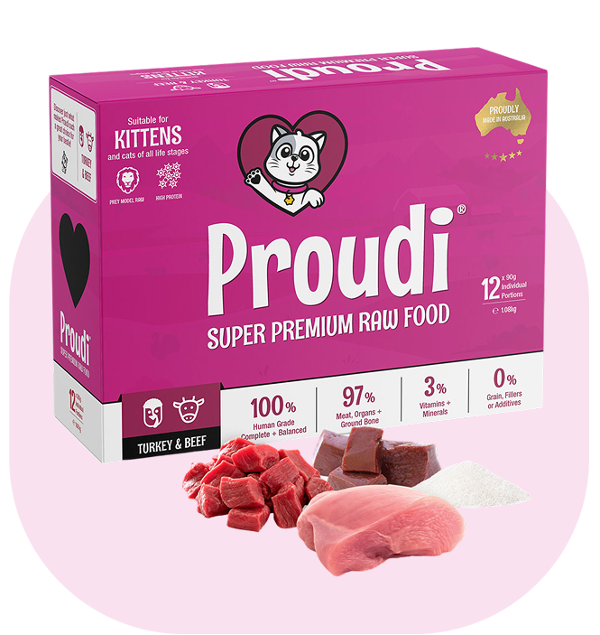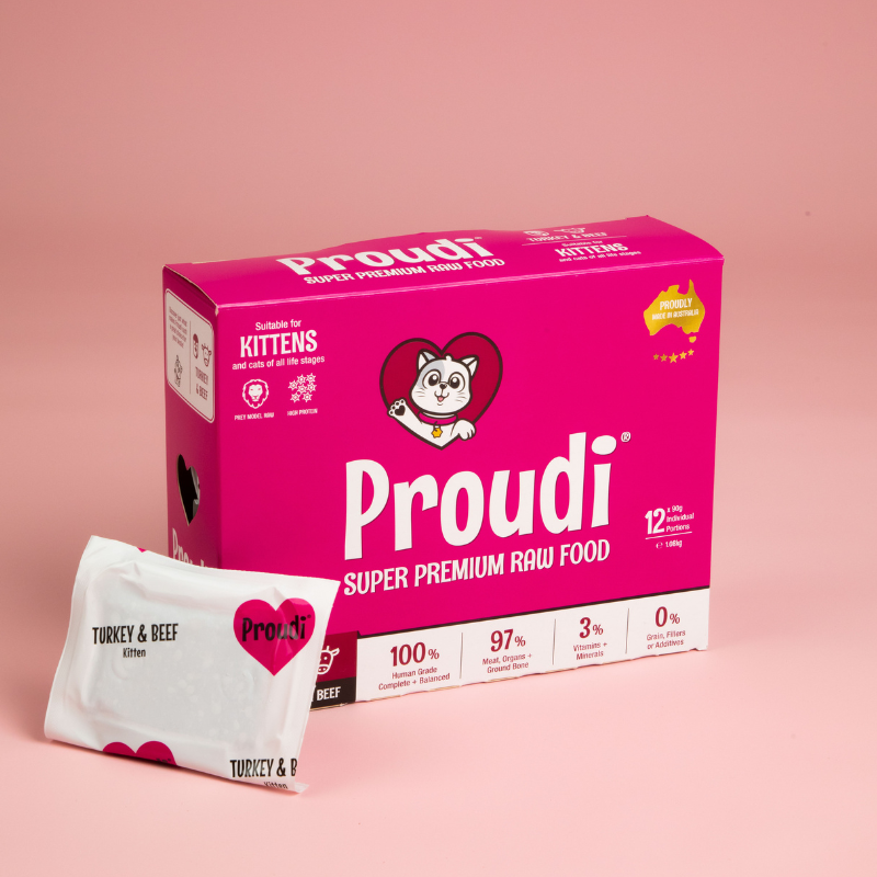 Proudi Raw Turkey & Beef Patties for Cats exceeds all nutrient levels required by AAFCO and FEDIAF for kittens and adult cats.